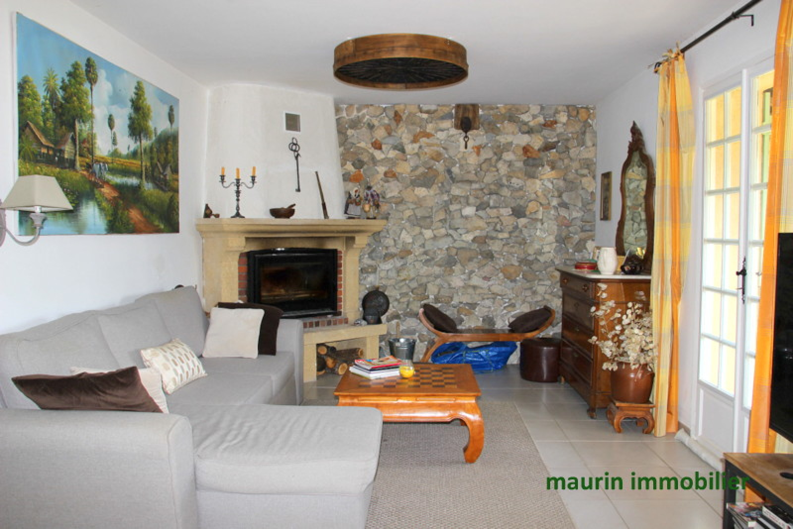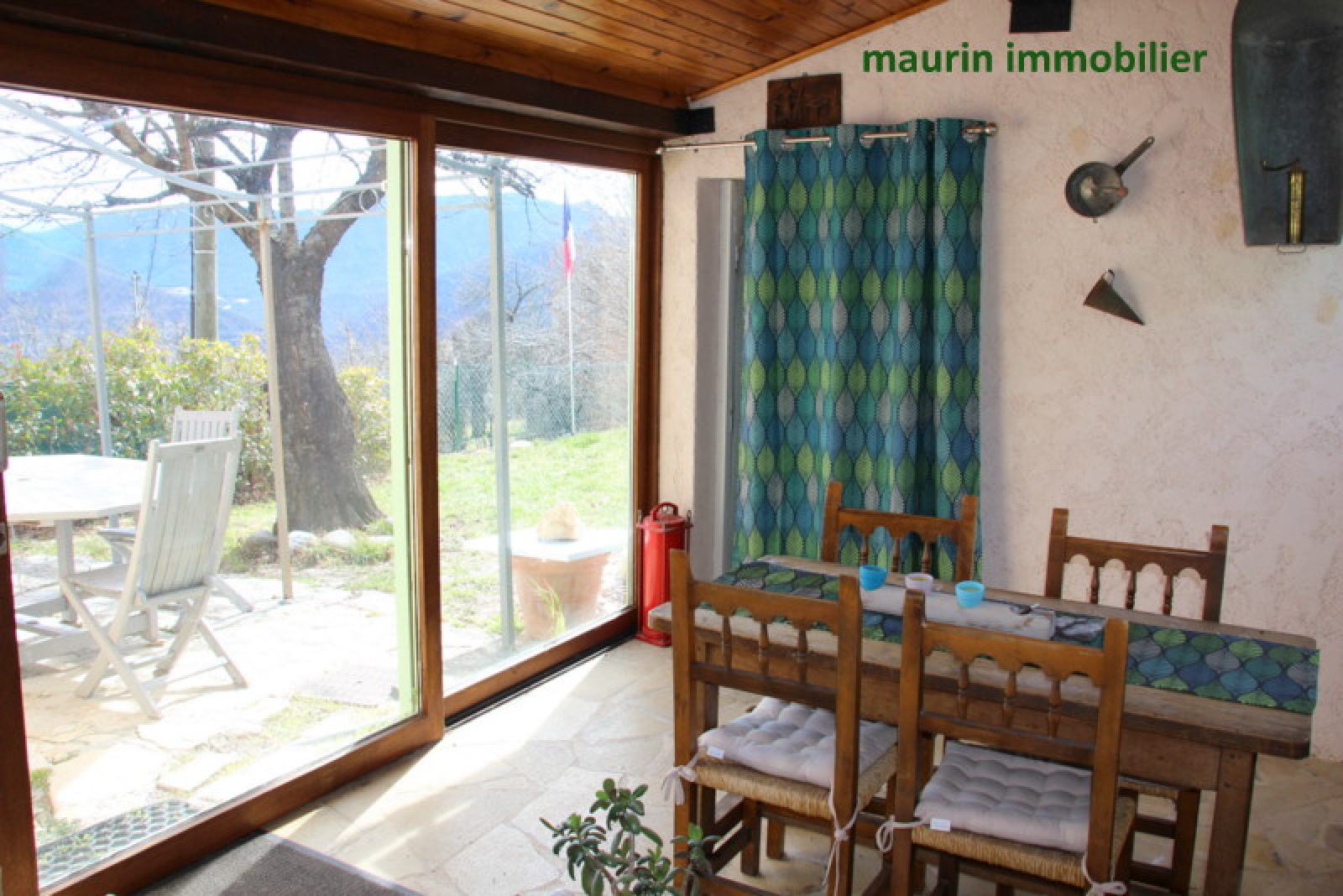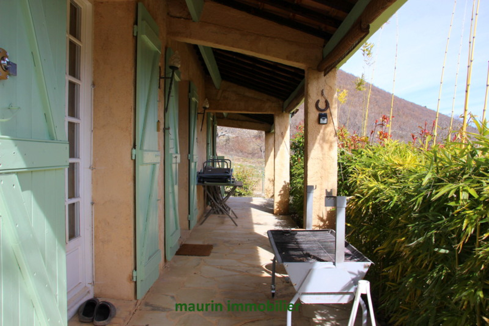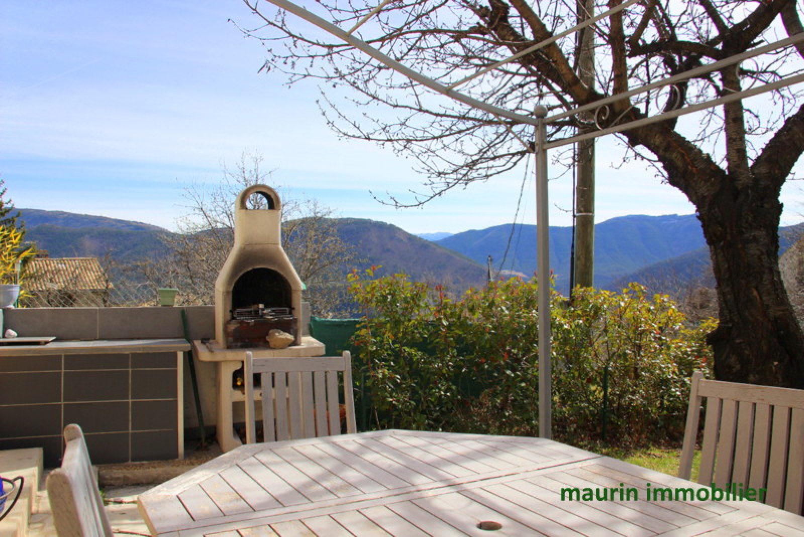 VENDU PAR MAURIN IMMOBILIER : Villa individuelle de plain pied offrant 90m² habitables composée d'un salon/séjour avec cheminée insert s'ouvrant sur une terrrasse couverte, cuisine aménagée, 3 chambres et véranda. Terrain plat et arboré de fuitiers de 200m² environs utiles, avec terrasse et barbecue. Située à 5 km des commodités dans un environnement calme et protégé. Vue dominante sur les montagnes. 60 minutes de Nice ouest.