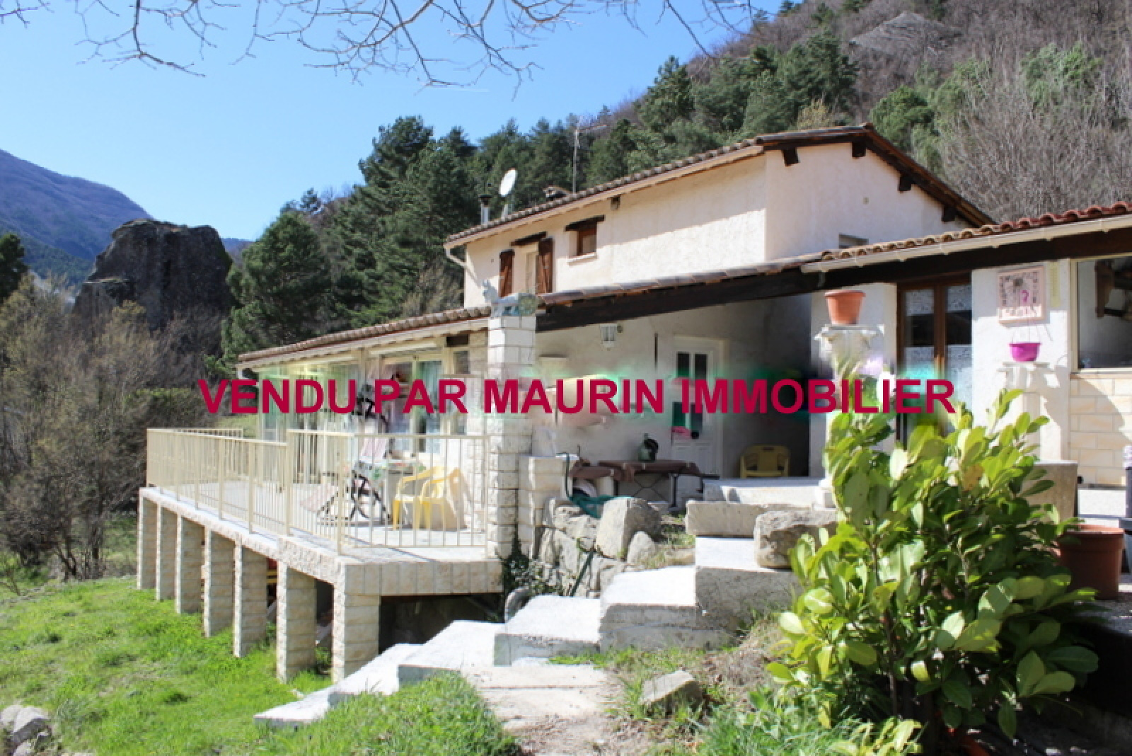 VENDU PAR MAURIN IMMOBILIER : Maison individuelle de 4 pièces de 95m² habitables avec terrasses plein Sud et cuisine d'été. Elle offre un séjour avec poêle à granules, cuisine aménagée, 3 chambres. Cellier/buanderie. Double vitrage, volets électrique. Au coeur d'un bel environnement de verdure avec son terrain en larges planches de plus de 3000m², arboré de fruitiers, eau de source. A 2km d'Annot, village toutes commodités, crèche, écoles et collège, 1H10 de Nice Ouest. Pour tout renseignement : 06 09 54 13 10 Mme Jonqua.